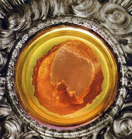 In the small Portuguese town of Santarém, a woman facing marital strife sought a sorceress’s help to restore her husband’s love, offering a consecrated Host as payment. During Mass, she took the Host, wrapped it in a veil, and hid it at home, where it began to bleed miraculously. Terrified and repentant, she confessed to her priest, who returned the Host to the Church of St. Stephen (now the Church of the Holy Miracle). The bleeding Host, preserved in a wax container, continues to exude a reddish substance, analyzed in 1997 by the World Health Organization as human blood of type AB. The miracle, approved by local Church authorities, led to the site’s recognition as a pilgrimage destination.
