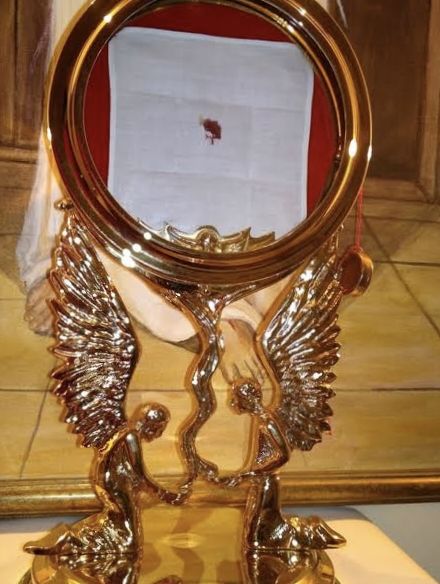 In the Eucharistic miracle of Blanot (France, 1331), during the distribution of Holy Communion on Easter Sunday, a consecrated Host accidentally fell from a women’s mouth onto the cloth on her hands. As the priest tried to retrieve it, he saw that the Host had left a clear, round stain of blood on the linen. Shocked and moved, he showed the cloth to the people. The bishop of the diocese later had it carefully examined, and it was confirmed that the reddish mark resembled a true stain of blood from the consecrated Host.